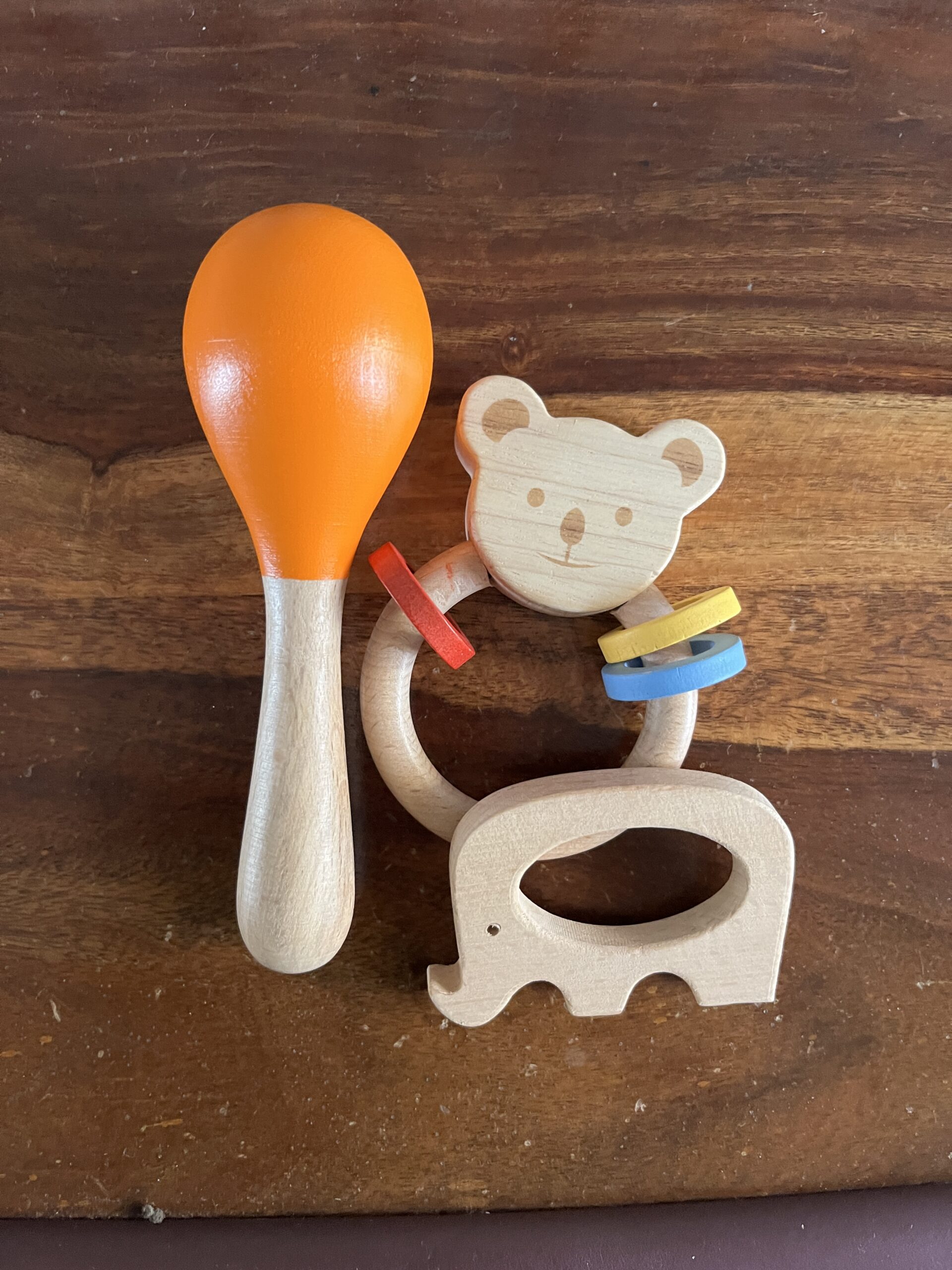 This wooden rattle, maracas, and bird teether combo is really impressive. All three pieces feel sturdy, smooth, and safe for my baby.