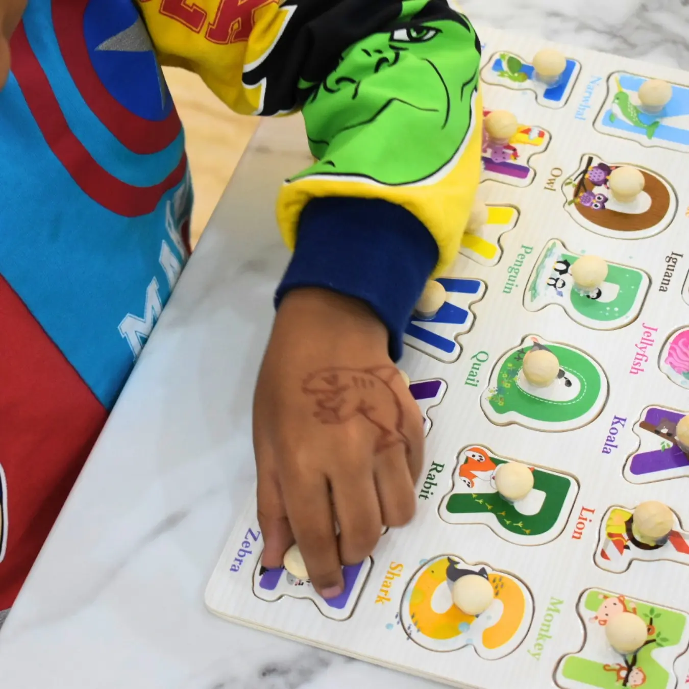 My daughter is fascinated by the animals on each letter. The knobs are perfect for tiny hands, and she easily picks and places each piece. It’s a great way to learn both alphabets and animals together!