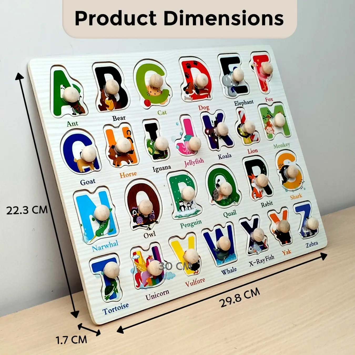The sturdy wooden knobs make it easy for little hands to grip and place each letter.