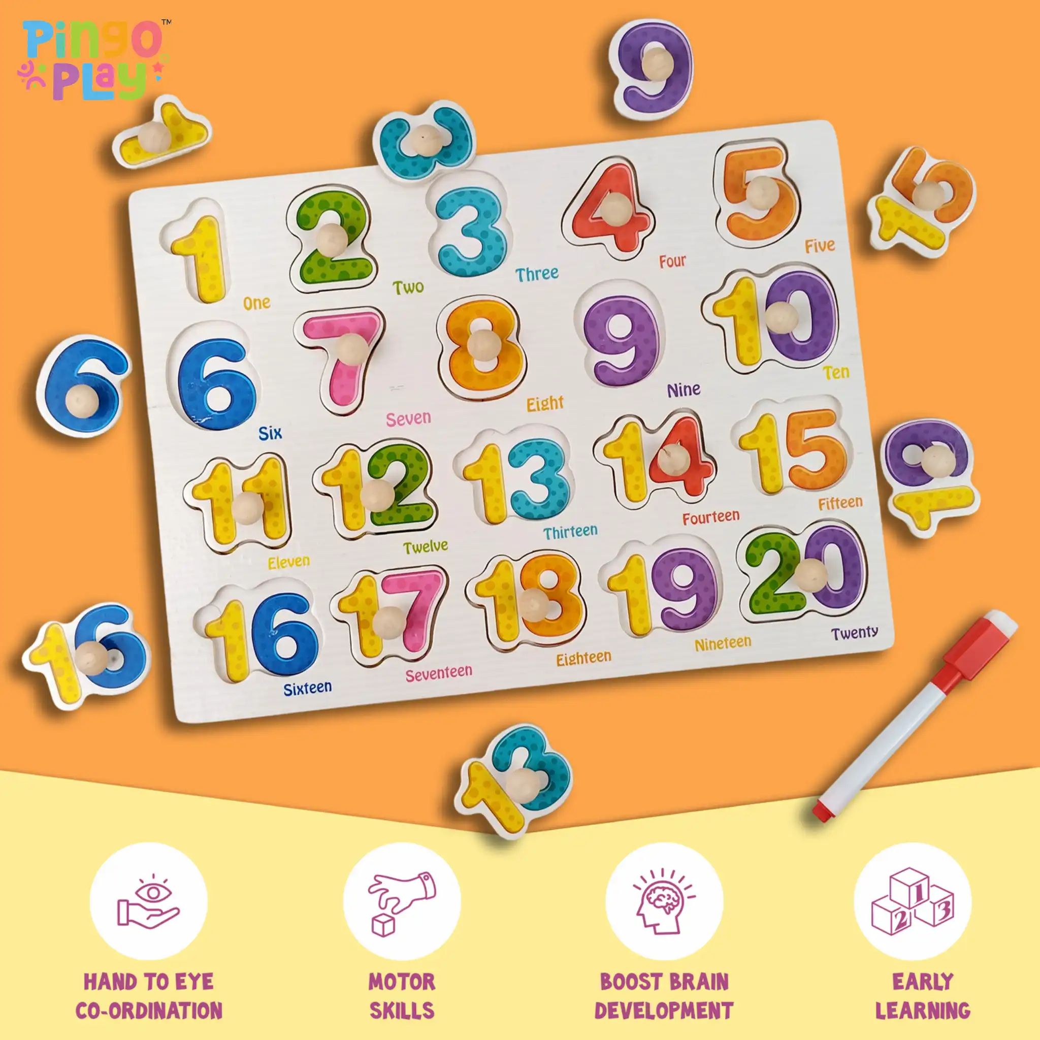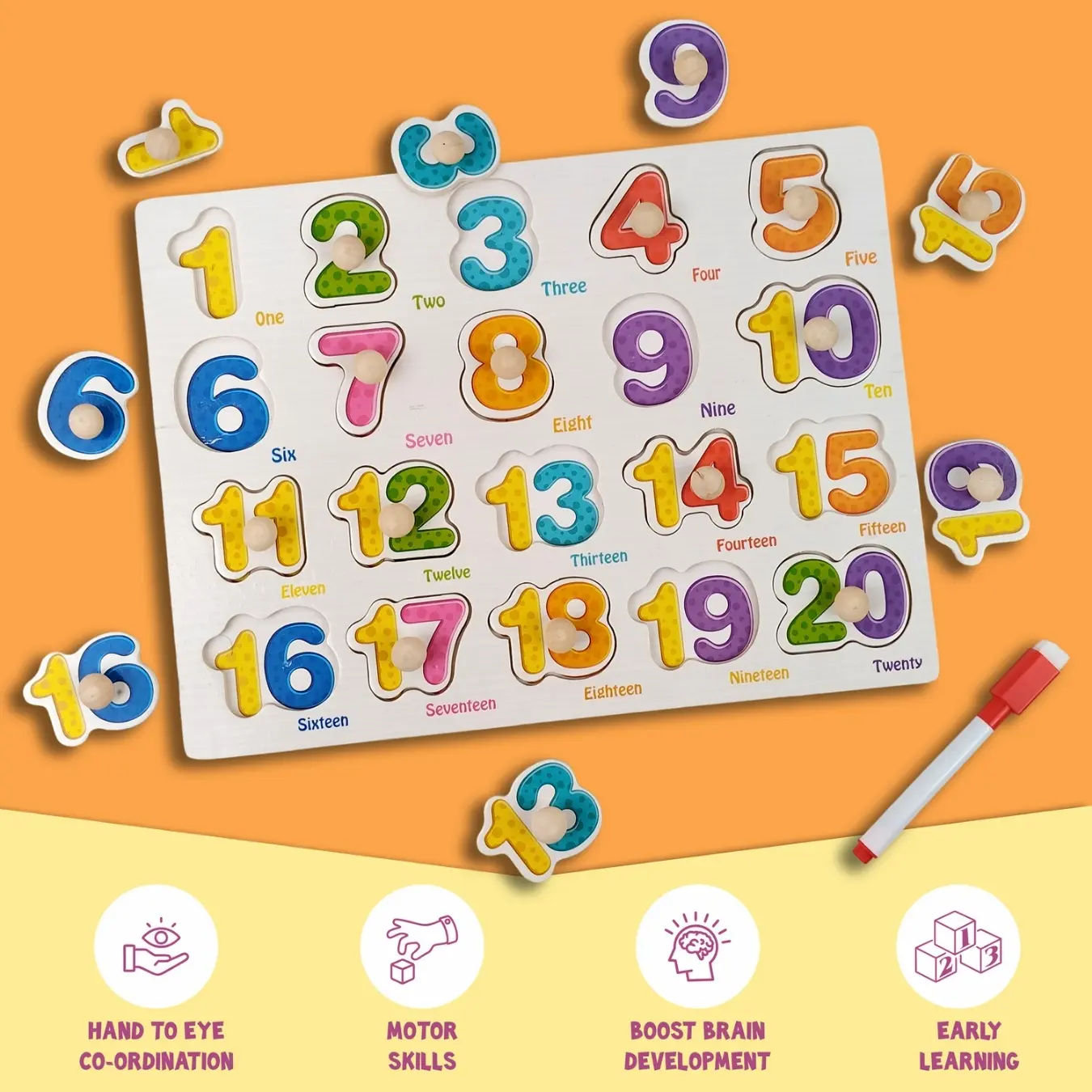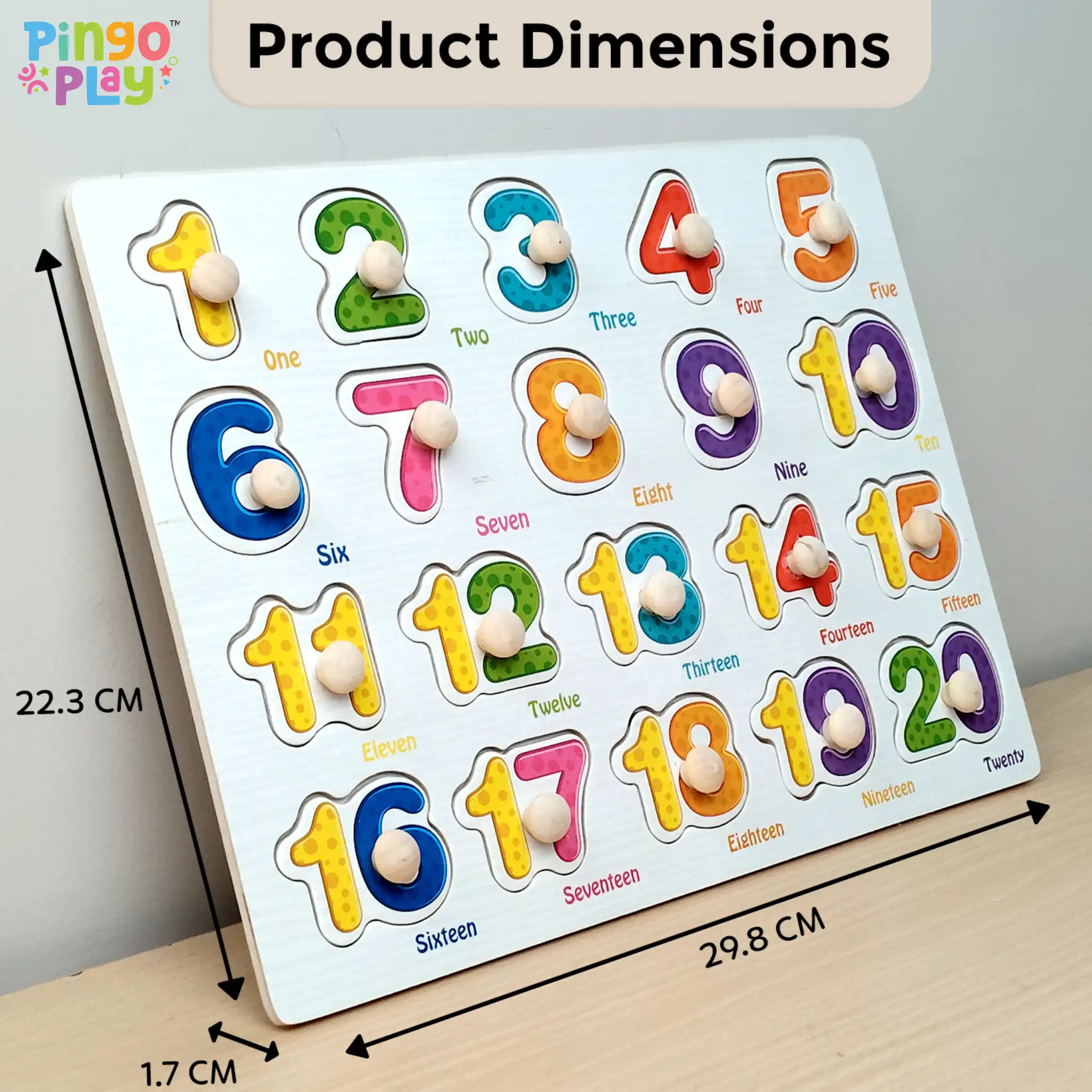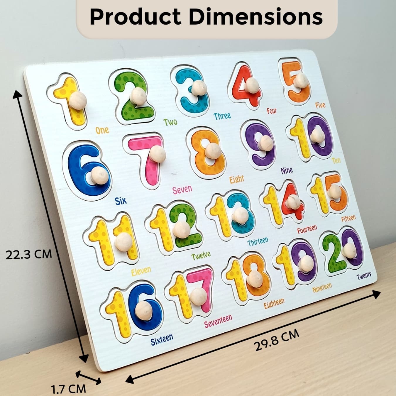 ⦁ Number Puzzle Play – Remove the wooden number pieces and let your child place them back in the correct slots using the knobs.