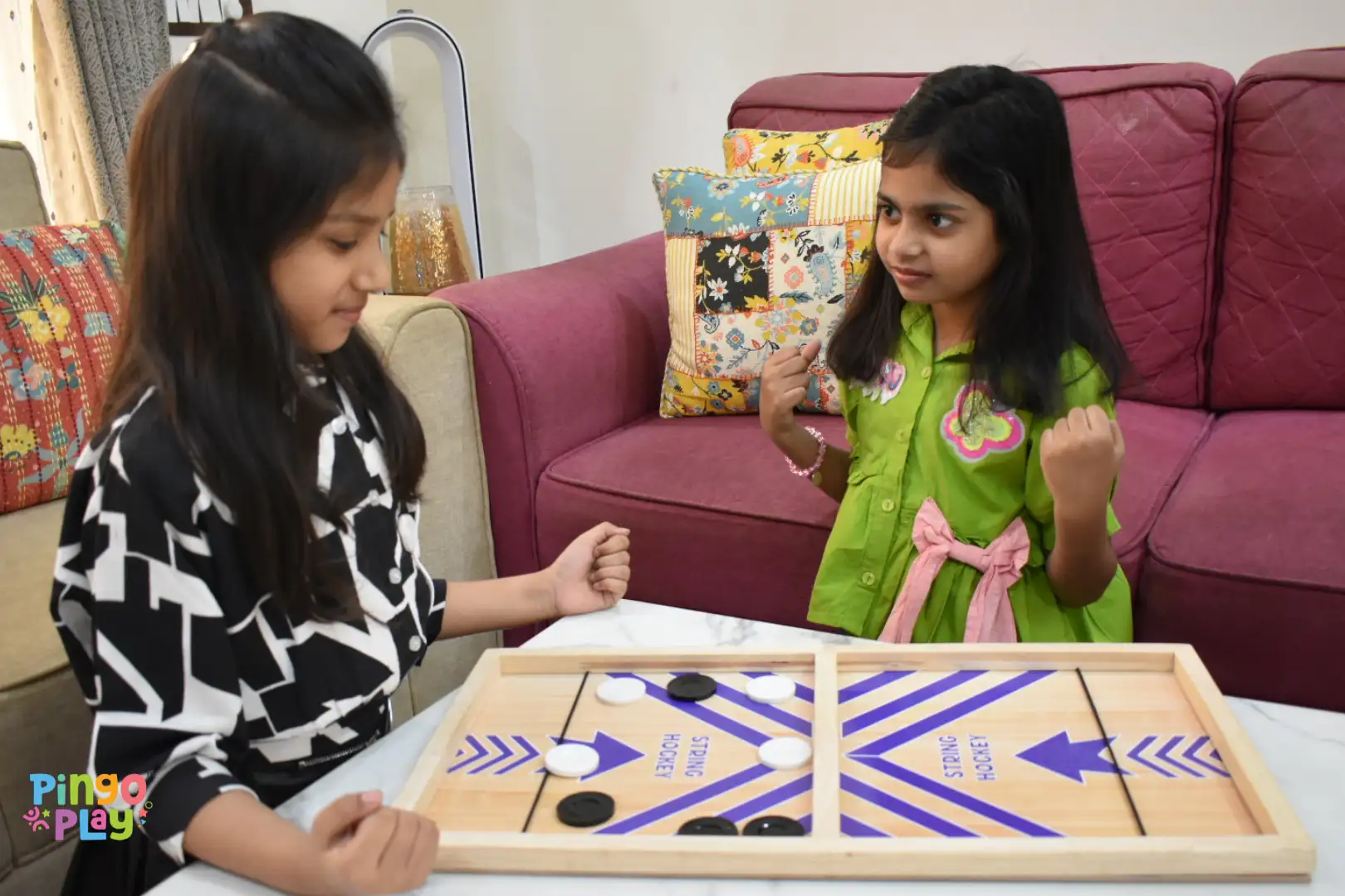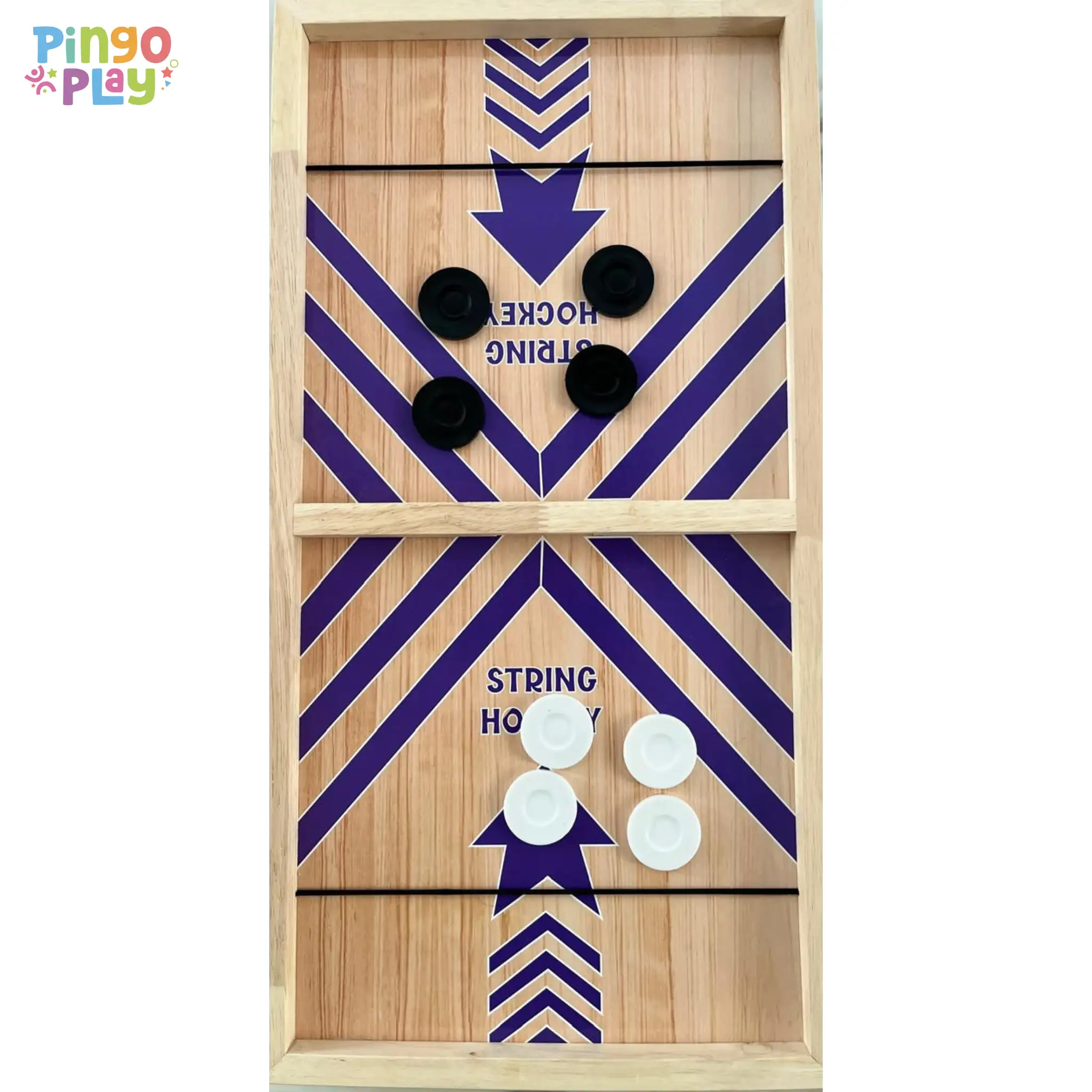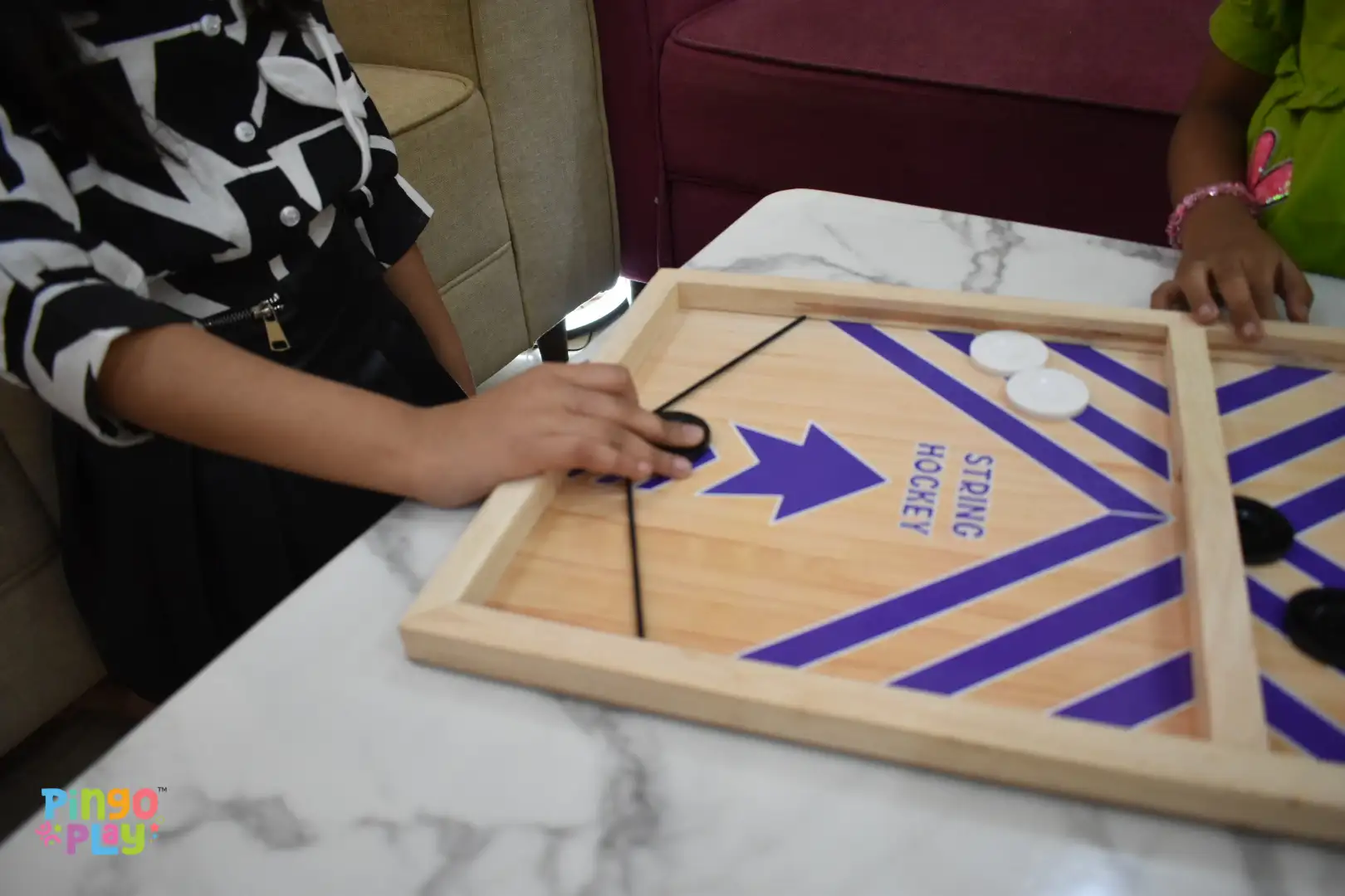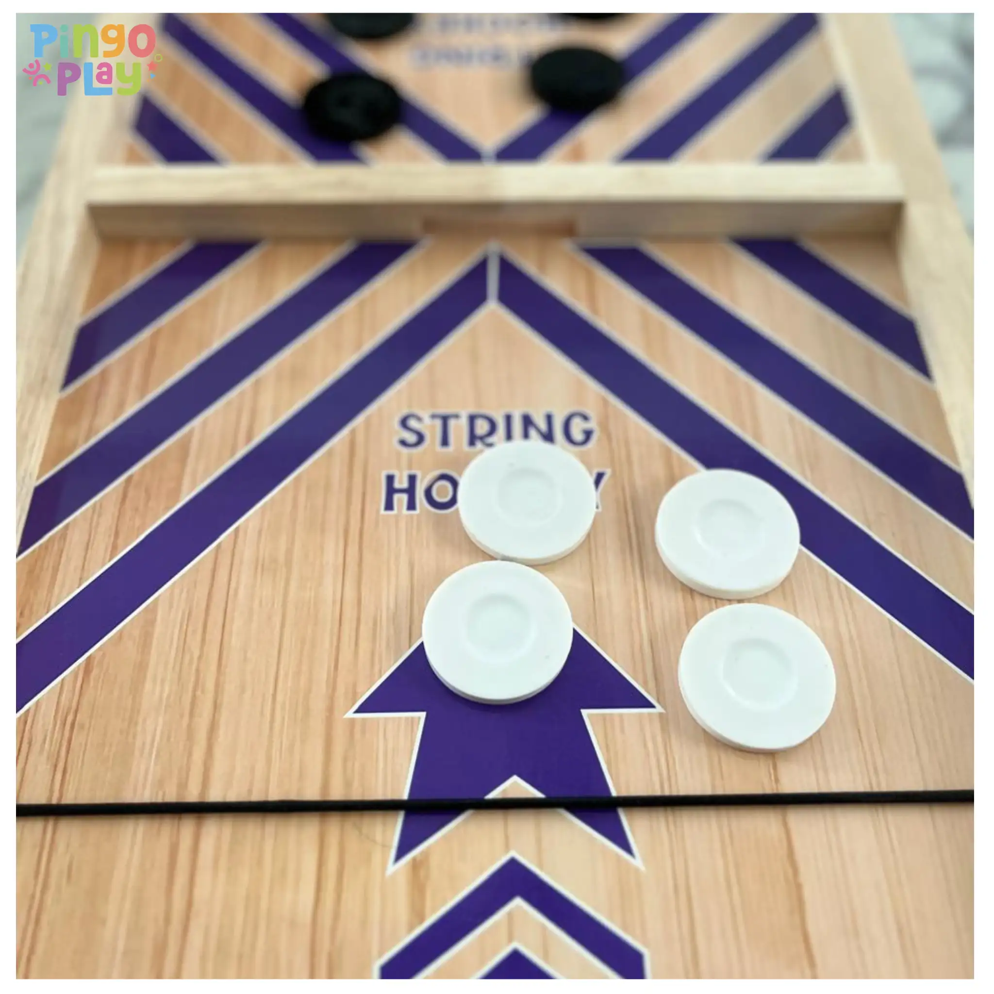 Bring home endless fun with the Pingo Play Wooden String Hockey Game – a fast-paced family game designed to challenge speed, focus, and coordination. Crafted from premium-quality wood with smooth edges, this exciting tabletop game encourages children and adults to compete by flicking pucks through the small slot using elastic strings. Simple yet highly engaging, String Hockey is perfect for family bonding, parties, and playdates.